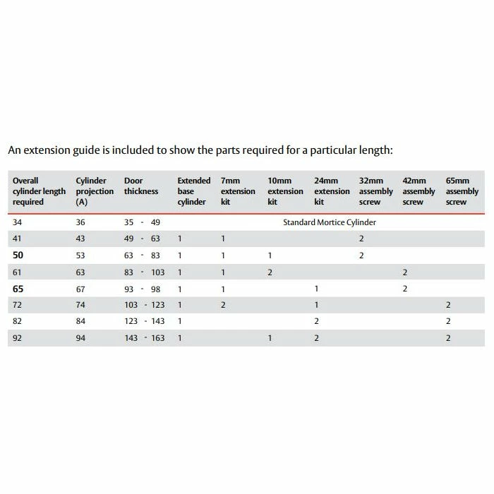 There are three different size extension kits that can be mixed and matched with the extended cylinder base to make up the desired length cylinder. They come in 7mm, 10mm and 24mm sizes. Each kit comes complete with the cylinder extension, barrel extension and universal barrel adaptor screwed to the barrel extension. Once the cylinder is assembled the rear barrel adaptor is removed and the standard locking cam (X, Z, Y, etc.) is fitted to operate the mortice lock.