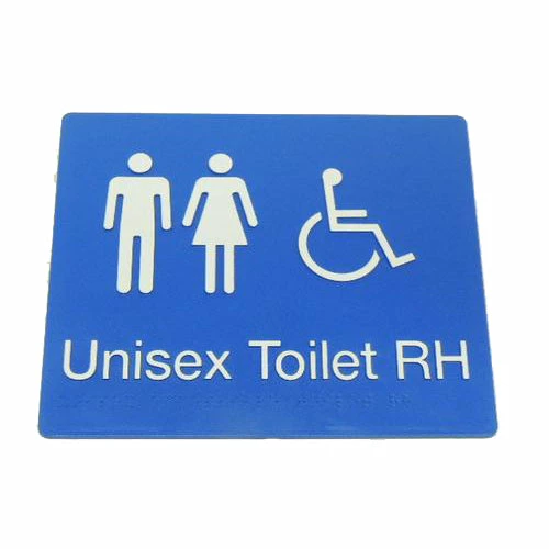 - Signage for unisex accessible facilities shall be provided with the letters LH or RH to indicate a left-hand or right-hand side transfer onto the WC pan. The min font size shall be 20 mm san serif